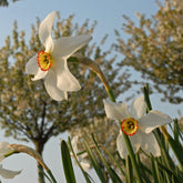 Narcissus poeticus var. recurvus – so lautet der offizielle Name dieser poeticusartigen Narzisse, eine Wildform. Im englischsprachigen Raum wird sie oft Pheasant’s Eye (Fasanenauge) genannt – eine sehr treffende Beschreibung. Diese spätblühende Narzisse ist ein Juwel und macht sich sowohl an einer prominenten Stelle in Ihrem Garten als auch verwildert am Gehölzrand gut. Ihre rein weiße Farbe kommt in dunkleren Ecken Ihres Gartens hervorragend zur Geltung. Wenn Sie ein paar Blumen abschneiden und in eine Vase stellen, werden Sie auch Ihren feinen Duft entdecken.